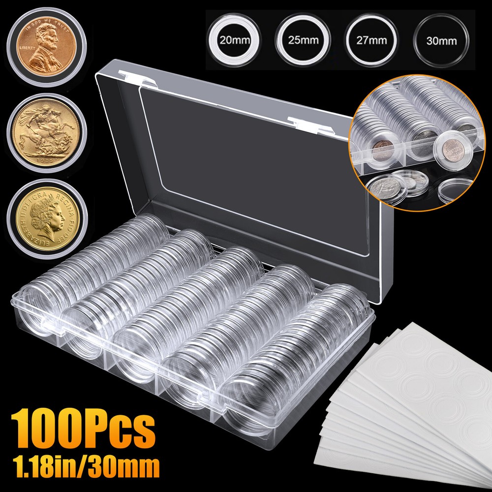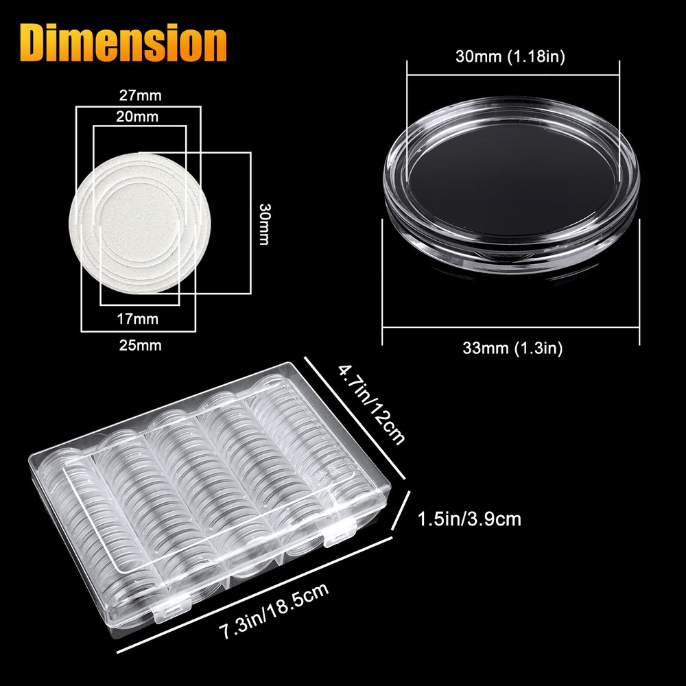Specification Type: 100-Pack 17-30mm Coin Capsule Round Box Quantity: 100 Color: Transparent Material: Plastic+EVA Inside Dimensions Of Coin Roller: 30 x 3 mm (1.18x0.12in) Outer Dimensions Of Coin Roller: 33 x 5.6 mm (1.3x0.22in) Inner Pad Size: 17/20/25/27/30mm Box Size: 18.5 x 12 x 3.9cm (7.3 x 4.7 x 1.5 in)