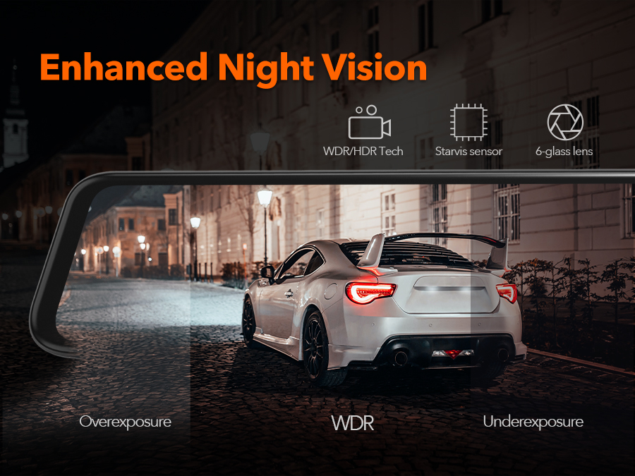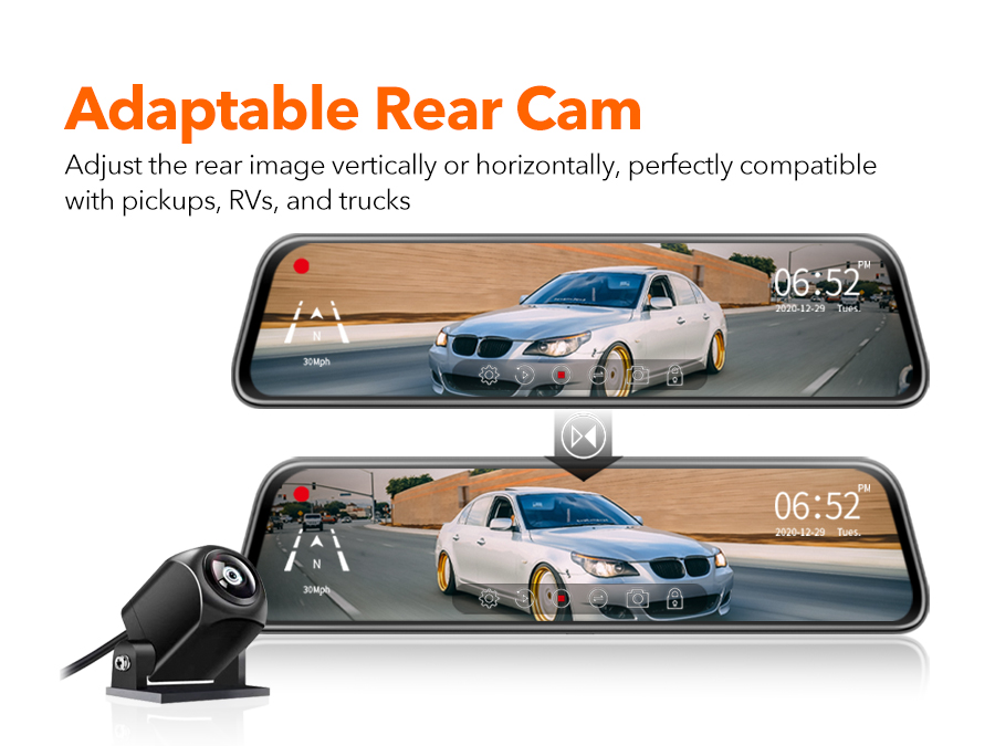 More SMART FUNCTIONS - ①Streaming Media Rearview; ②Upside down of rear view ③Mirror Flip of Rear Image; ④G-Sensor; ⑤Loop Recording; ⑦Adjustable Display View Angle, etc