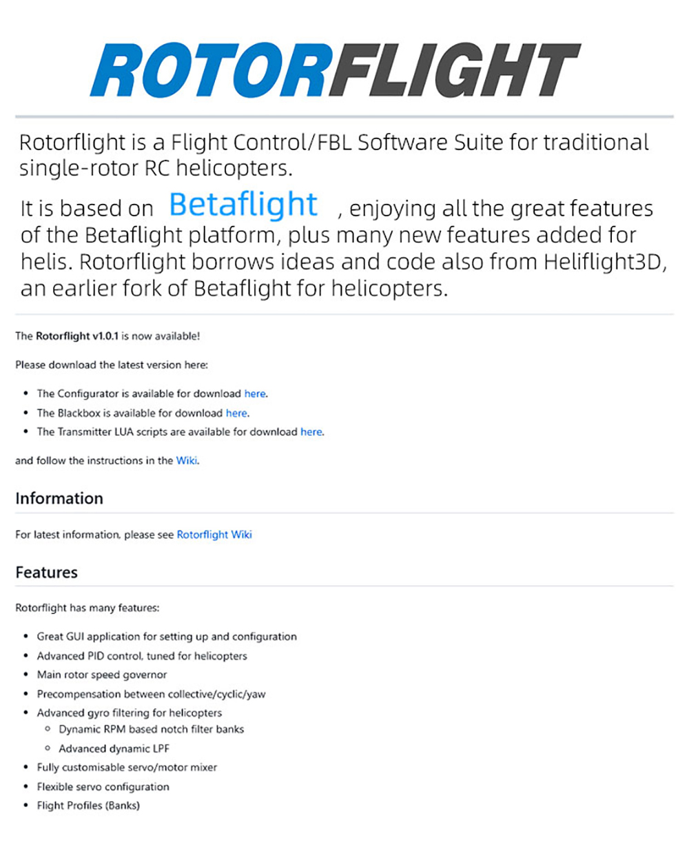 Rotorflight hat eine großartige GUI-Anwendung zum Einrichten und Konfigurieren. Erweiterte PID-Steuerung, abgestimmt auf Hubschrauber. Hauptrotor-Drehzahlregler. Fortschrittlicher dynamischer LPF.Vollständig anpassbarer Servo-/Motormischer.Flexible Servokonfiguration.Flugprofile (Bänke)