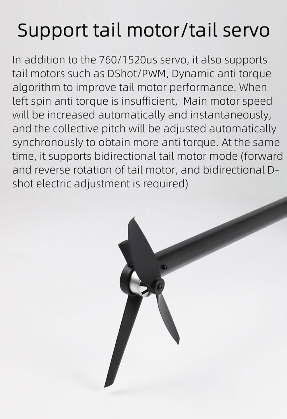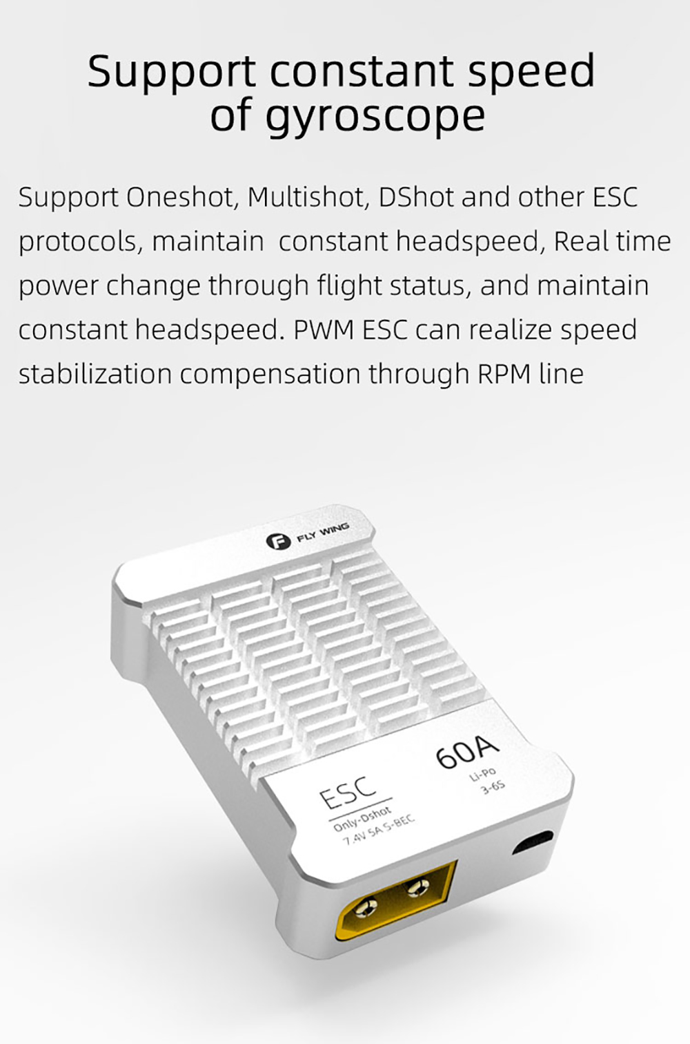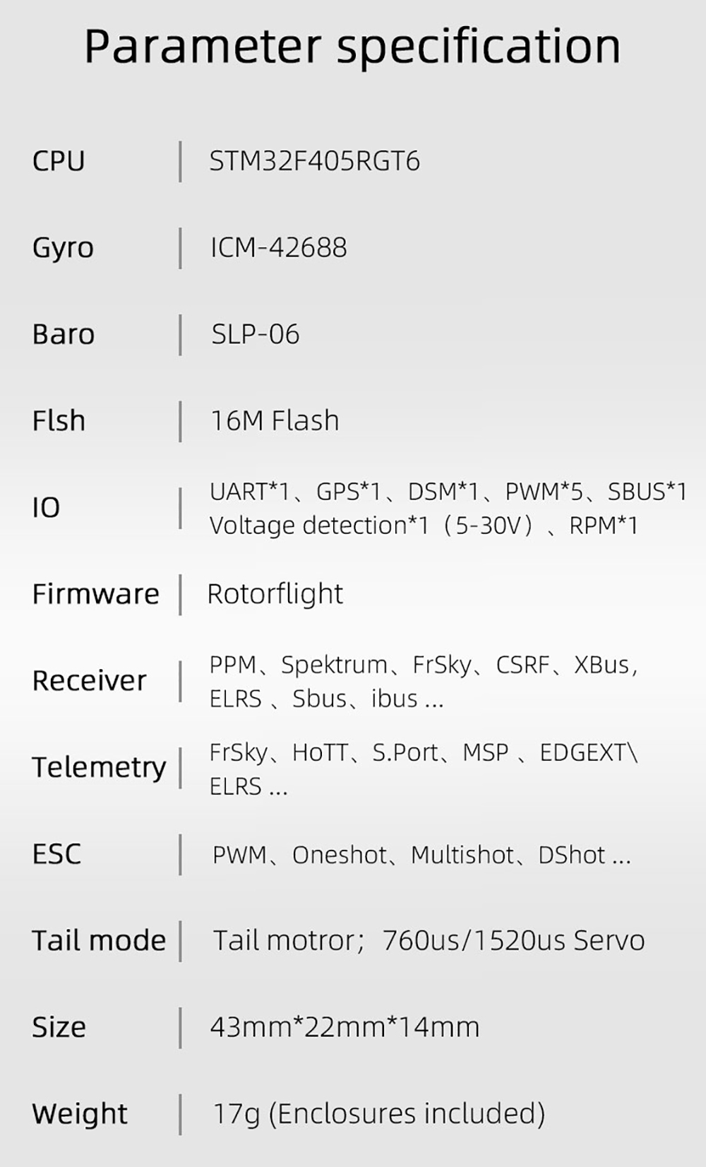4.Gyroskop: Unterstützt eine konstante Geschwindigkeit des Gyroskops. Unterstützt Oneshot-, Multishot-, Dshot- und andere ESC-Protokolle, behält eine konstante Kopfgeschwindigkeit bei, ändert die Leistung in Echtzeit durch den Flugstatus und behält eine konstante Kopfgeschwindigkeit bei. PWM ESC kann eine Geschwindigkeitsstabilisierungskompensation über die RPM-Leitung realisieren