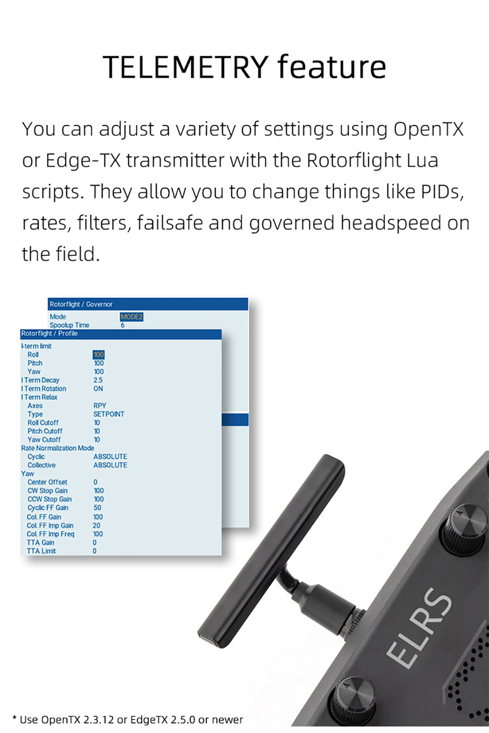 5. Telemetriefunktion: Sie können eine Vielzahl von Einstellungen mit OpenTX- oder Edge-TX-Sender mit den Rotorflight Lua-Skripten anpassen. Sie ermöglichen es Ihnen, Dinge wie PIDS, Raten, Filter, Ausfallsicherheit und geregelte Kopfgeschwindigkeit auf dem Feld zu ändern. Spanne>