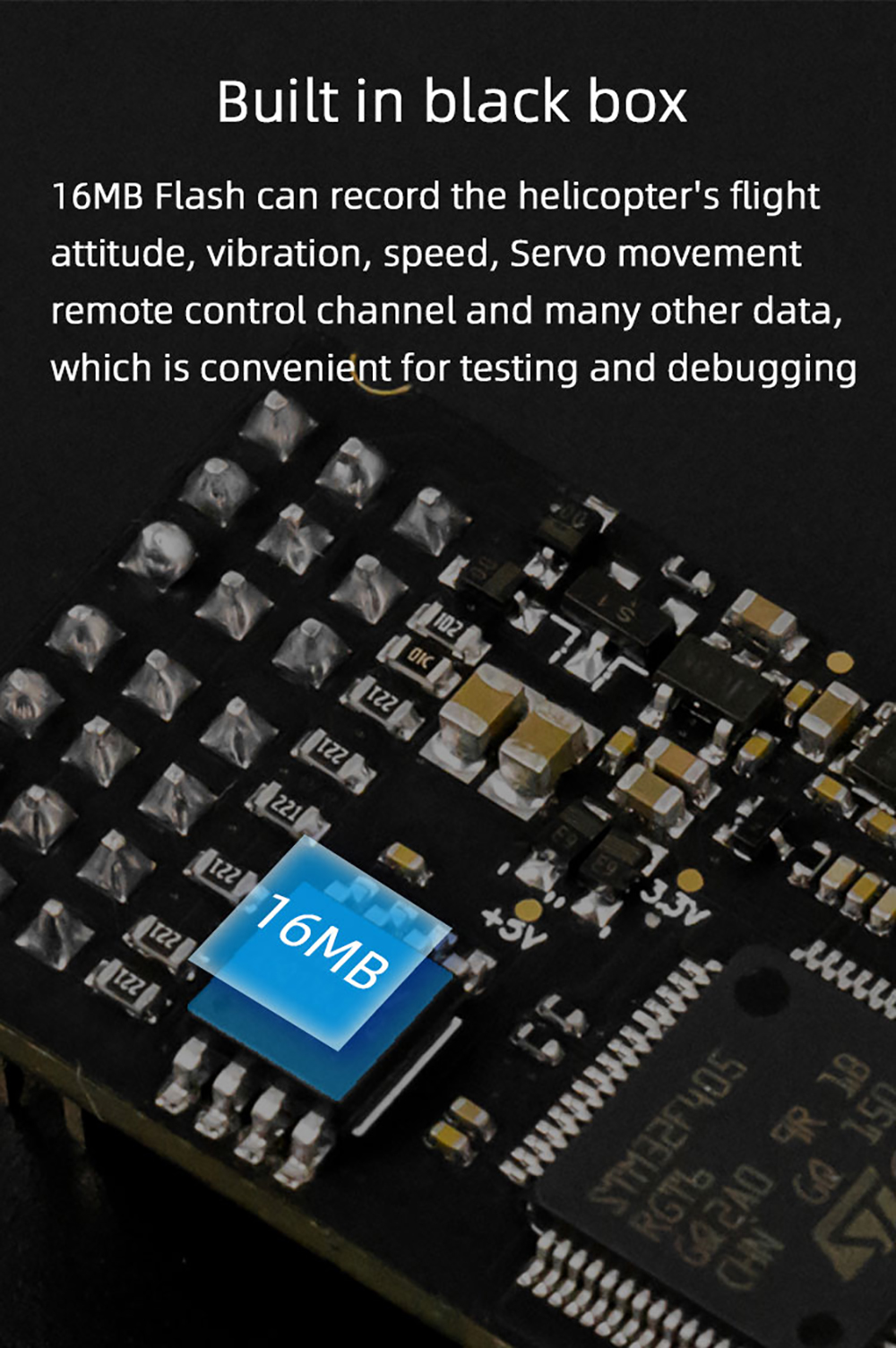 3. Eingebaute Black Box: 16 MB Flash kann die Fluglage, Vibration, Geschwindigkeit, den Fernsteuerungskanal der Servobewegung und viele andere Daten des Hubschraubers aufzeichnen, was zum Testen und Debuggen praktisch ist