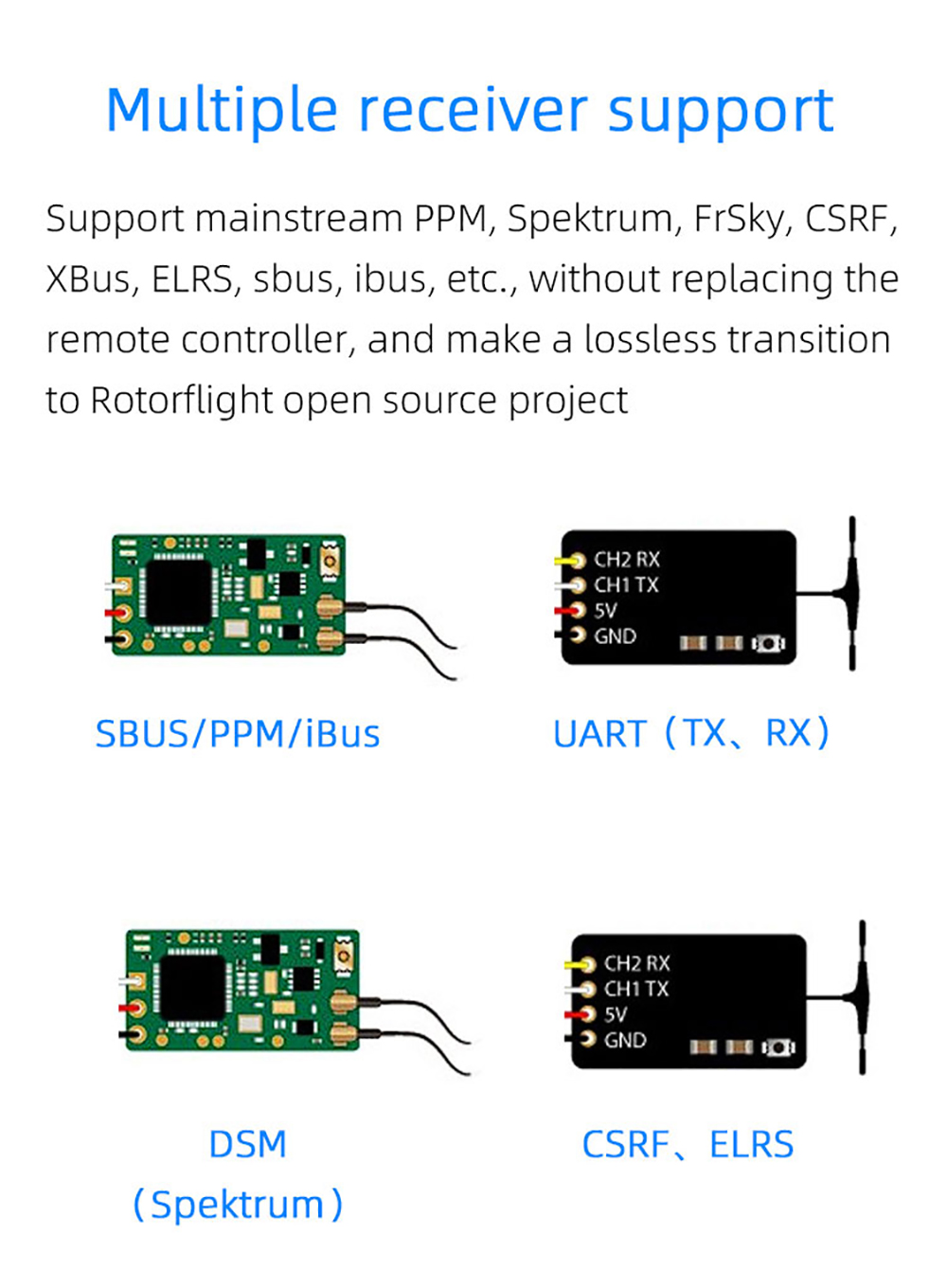 2.Unterstützung mehrerer Empfänger: Unterstützt Mainstream-PPM, Spektrum, Frsky, CSRF, XBUS, ELRS, sbus, ibus usw., ohne die Fernbedienung auszutauschen, und macht einen verlustfreien Übergang zum Open-Source-Projekt Rotorflight