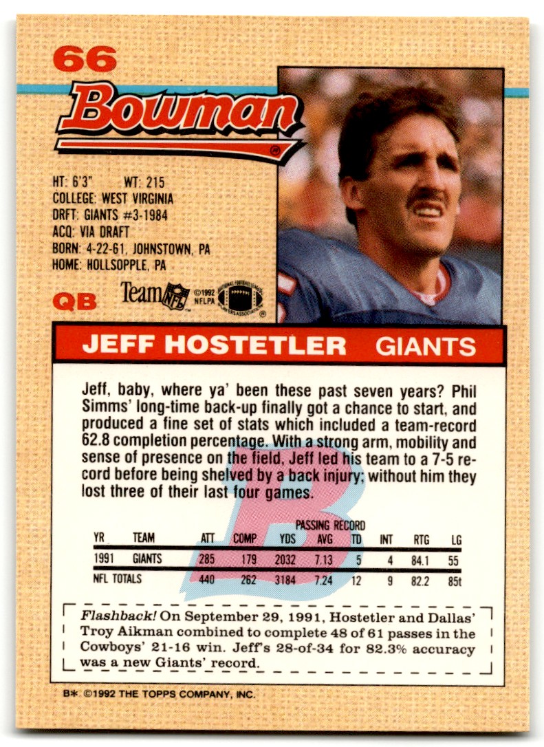 | 1992 Bowman Jeff Hostetler #66 New York Giants |