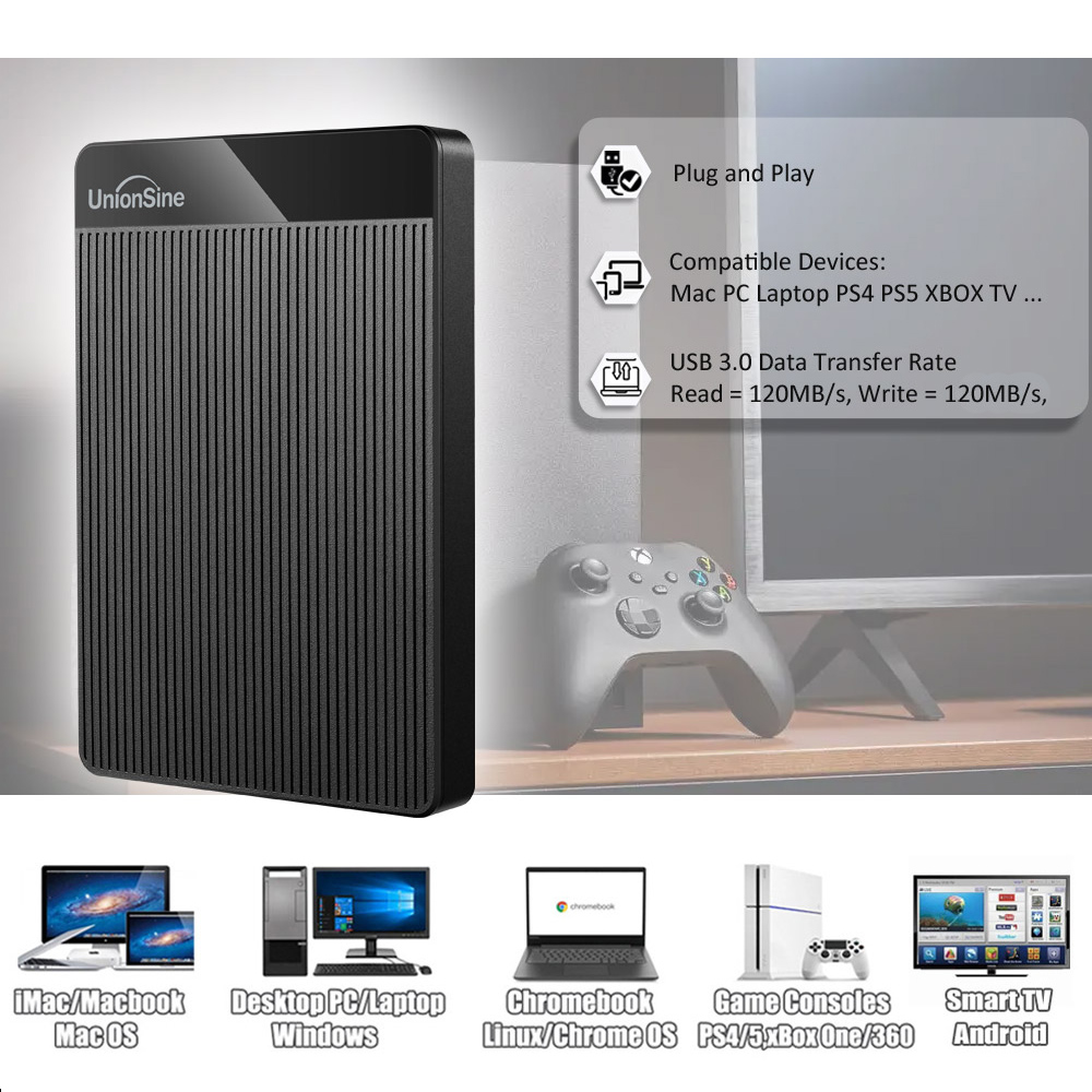 UnionSine USB 3,0 Externe Festplatte Tragbare 2,5" HDD Extended Device für Windows Desktop PC Chromebook Tablet Laptop, iMac Macbook, Xbox 360/One/X/S, PS3/PS4, Android, Smart TVs.