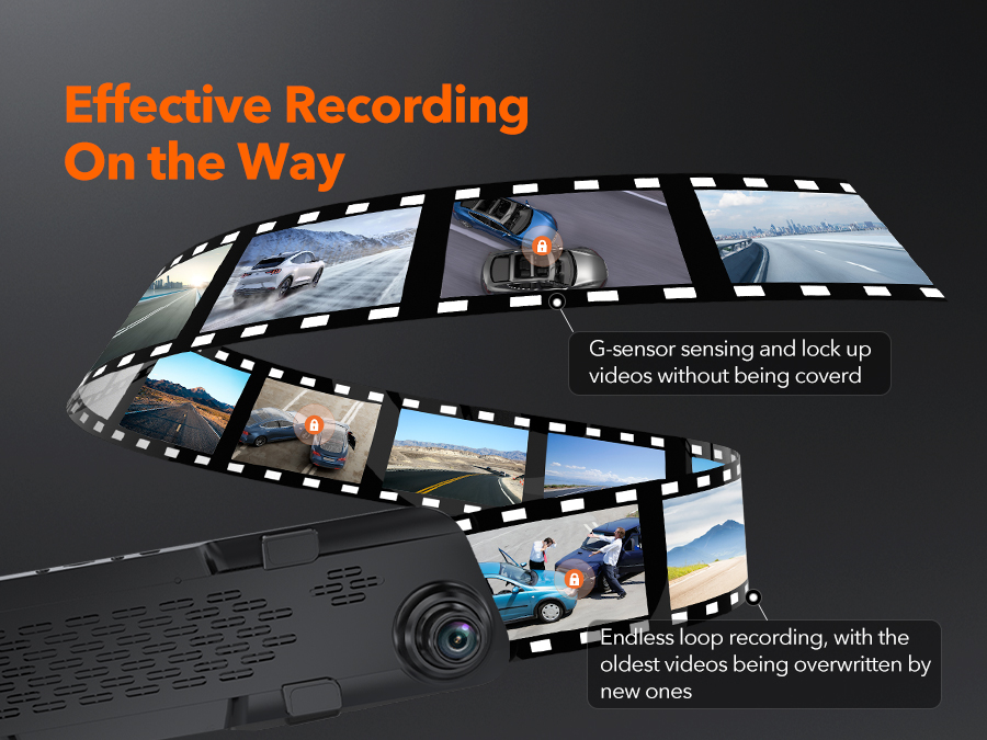 More SMART FUNCTIONS - ①Streaming Media Rearview; ②Upside down of rear view ③Mirror Flip of Rear Image; ④G-Sensor; ⑤Loop Recording; ⑦Adjustable Display View Angle, etc