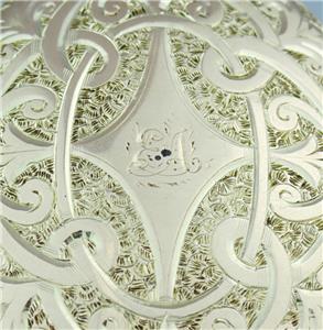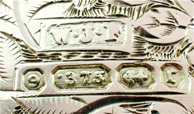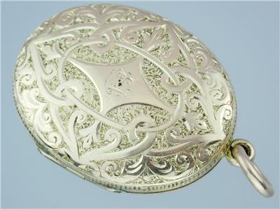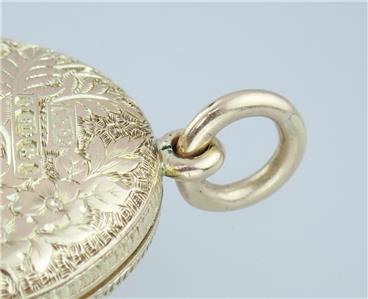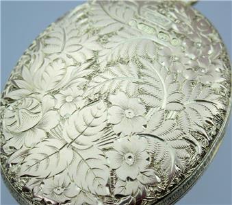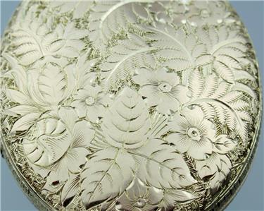 This exquisite Victorian solid 9k yellow gold locket has breathtaking carving on both front and back, the front with a fabulous Celtic style endless love knot with intertwined scrolling hearts and floral scrolls throughout with a central diamond-shape plaque romantically engraved with the initials 'EA' with every surface around the knot covered with unbelievably intricate little floral engravings, the reverse with an incredible floral scene with lovely flowers and scrolling leaves all over with yet further tiny floral engravings between, the top with an attached hanging loop and large bail, the edges detailed with fabulous gold engraved line decorations all around-absolutely FANTASTIC! The locket has English hallmarks with maker 'W.J.F.', '9 .375', the Birmingham anchor and date letter 'C' for 1877, the bail is also stamped '9 .375' and the inside '.375'. The locket tests for 9k* gold and has the usual various base metal elements to the inside structure.