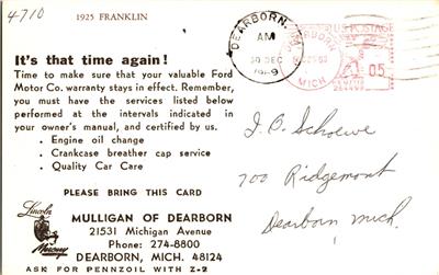 Really nice card reminding a person to get their car check-up at this car dealership (Now Pat Mulligan Ford) in Dearborn Michigan