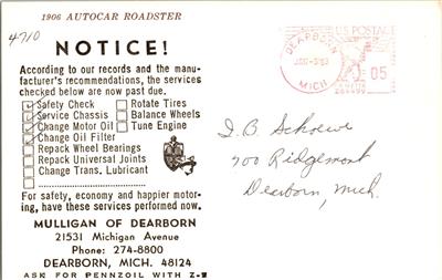 1906 Autocar Roadster Mulligan Dearborn MI Car Dealership Advertising Postcard