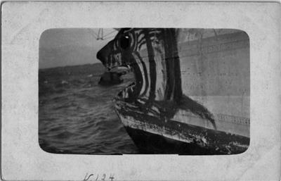 Really old postcard showing the figurehead on the bow of a ship appearing to about to eat a buoy in the water.