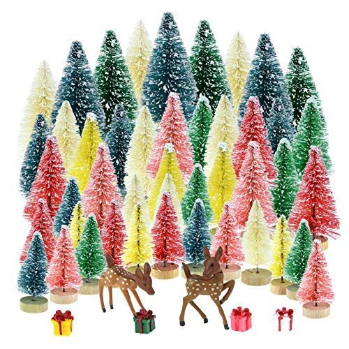 PACKAGE INCLDING: 45 Pieces mini pine trees, 4 pieces Christmas gifts boxes and 2 pieces deer. Beige, yellow, green, dark green, pink, red in small size and beige, green, dark green in middle size. There are many colors and sizes for the mini pine trees and frosted sisal trees, which can be combined and matched arbitrarily.