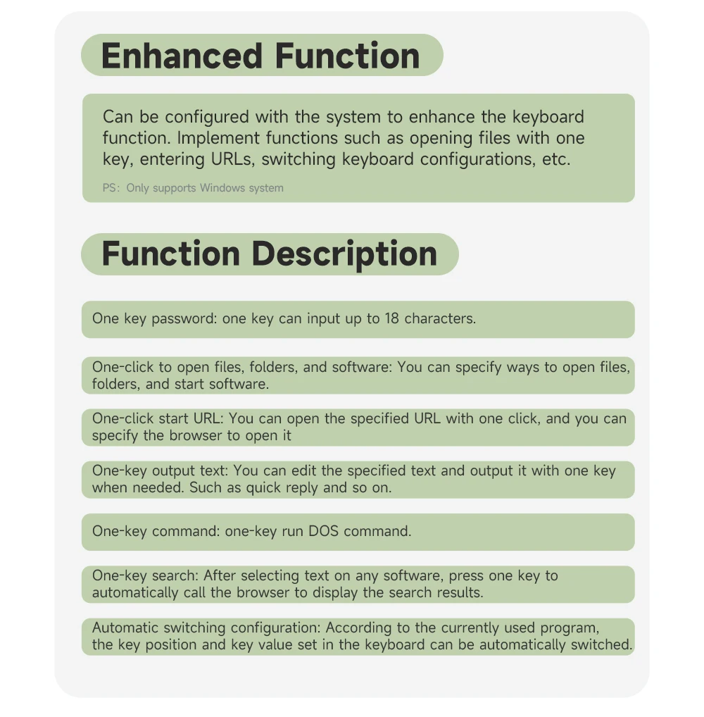 - 【Memory Function】The Keyboard has a Storage Function, which Can be Used on Systems that Support USB Protocol such as for Linux, for IOs, etc. After Setting it up on the for Windows System.