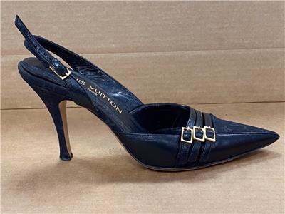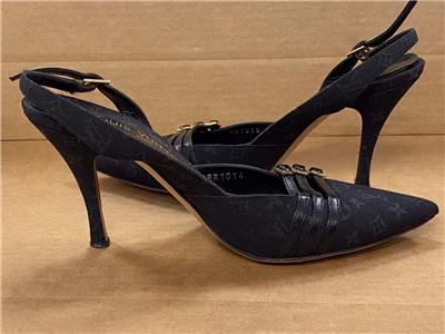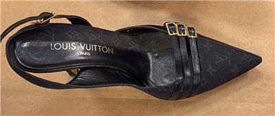 Louis Vuitton MONOGRAM OPEN BACK STAP BLACK PUMPS SIZE 36- USED. ITEM IS USED WITH COSMETIC WEAR DUE TO BEING WORN, STRAP IS A LITTLE TORN AND ALSO RIGHT FOOT WHERE HEEL PART IS FALLING APART, PLEASE SEE PHOTO'S FOR CONDITION. PUMPS ONLY.
