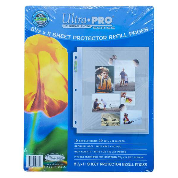 Ultra PRO's 3-Hole Photo Pages are designed to fit 8.5" x 11" sized prints, 1-pocket front & back (double-sided). Each page holds two photos in total. Archival quality pages are perfect for photos, cards, coupons, and other collectibles. Pages are clear on both sides and fit in our 3-Ring 8.5" x 11" Photo & Scrapbook Albums.