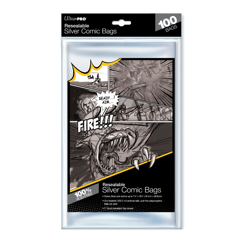 Ultra-clear, archival-safe comic bags designed to fit Silver Age size comics up to 7-1/8" x 10-1/2" in dimension. 100 per pack, acid-free, and no PVC. Resealable flap provides extra protection and easy removal.