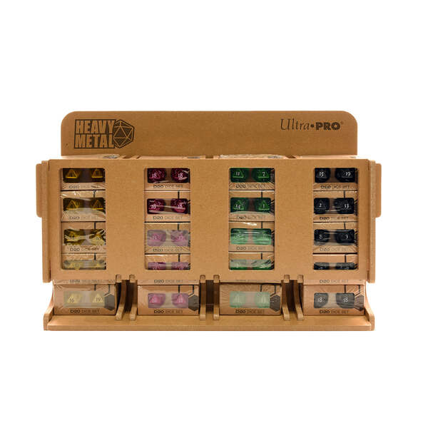 Increase your store's impulse sales with Ultra PRO's line of Heavy Metal Dice set. This starter pack comes with an attractive, slim fixture to dispense our popular D20 two-dice packs. The fixture is offered for FREE in this retail starter kit, shipped flat and can be easily constructed by following a few simple steps. This set Heavy Metal Retail Combo Pack includes an assortment of 4 different colors: Black, Pink, Green and Yellow; each color comes with 5 sets as your starting inventory (20 sets total).