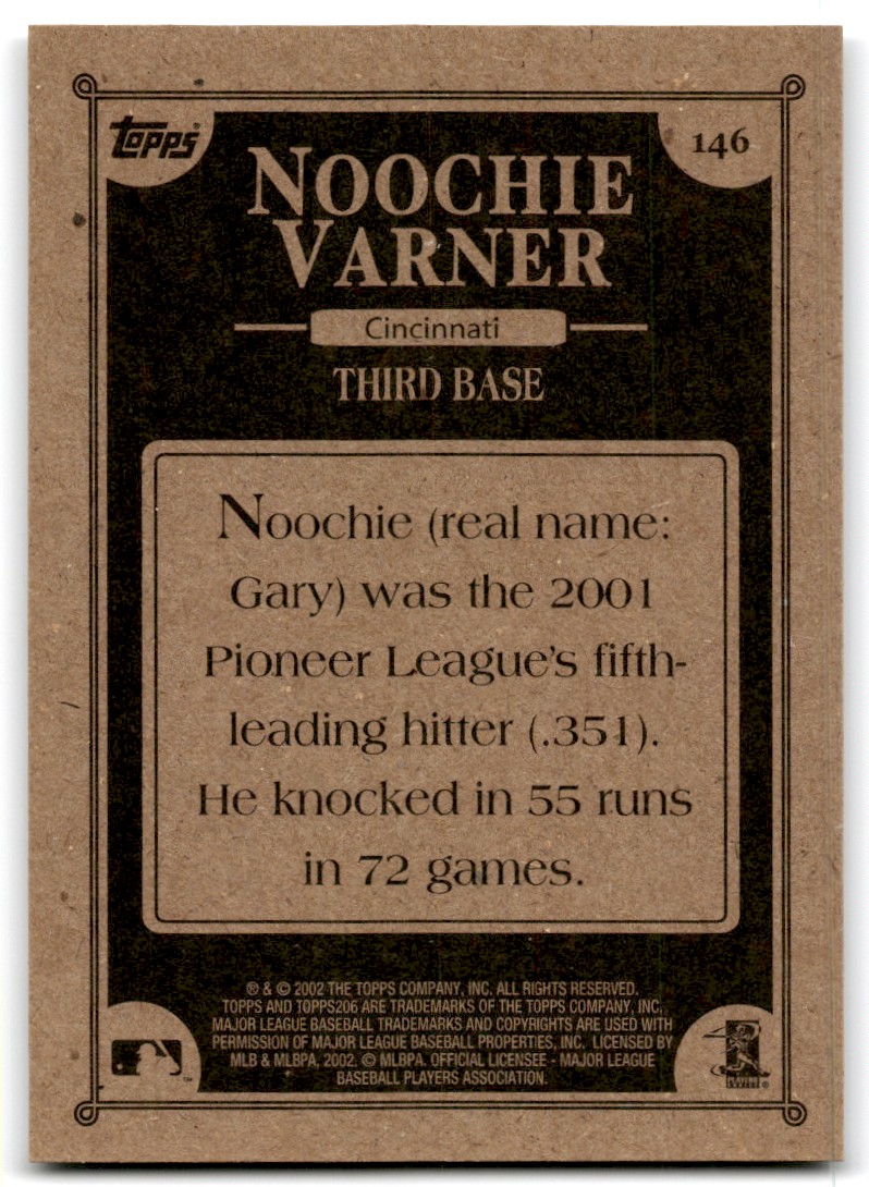 | Description: | Noochie Varner | | Category: | Baseball | | Year: | 2002 | | Product: | Topps 206 | | Team: | Baseball Cards | | Card Number: | 146 | | Dimensions: | 3½" x 2½" |