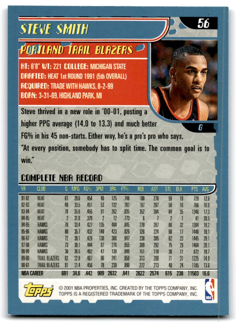 | Description: | Steve Smith | | Category: | Basketball | | Year: | 2001 | | Product: | Topps | | Team: | Basketball Cards | | Card Number: | 56 | | Memorabilia: | A | | Special: | | | Dimensions: | 3½" x 2½" |