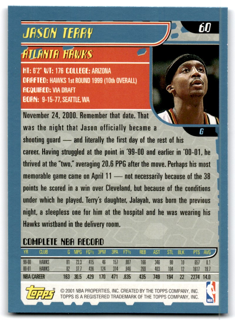 | Description: | Jason Terry | | Category: | Basketball | | Year: | 2001 | | Product: | Topps | | Team: | Basketball Cards | | Card Number: | 60 | | Dimensions: | 3½" x 2½" |