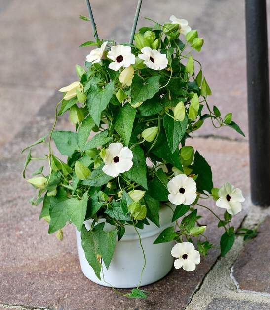 OTHER: Black Eyed Susan Vines are great trailing out of hanging baskets or containers or climbing fences. This uncommon white type with black eyes are quite stunning. They attract bees, birds, & butterflies, and their only desire is to make you smile!