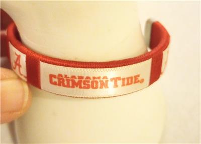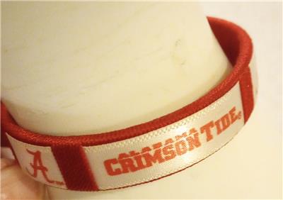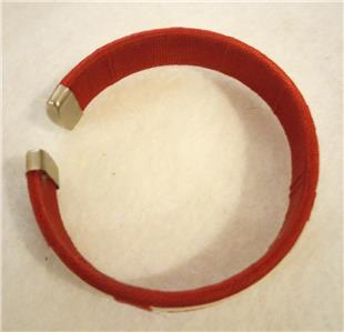 Cuff style bracelet with enough flexibility to get it on and off. Covered with grosgrain ribbon with another sort of satiny printed ribbon woven through the grosgrain. About 2-1/2" in diameter and about 1/2" wide. Cute bracelet to wear to games to show your team spirit! I don't know what the interior of the bracelet is made of but it's very lightweight. The ends are capped in metal.