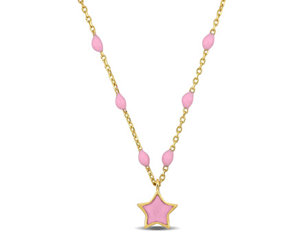 Add a touch of whimsy and charm to your ensemble with this delightful 14K yellow gold pink enamel star necklace. The dainty chain features a lovely pink star pendant, creating a playful and eye-catching design. With a length of 16 inches and a 2-inch extender, you can adjust the necklace to your desired fit. The 14K yellow gold construction lends a luxurious and radiant shine to the piece, enhancing its overall beauty. Secured with a convenient spring ring clasp, this necklace is both stylish and easy to wear. Whether worn on its own as a sweet accent or layered with other necklaces for a trendy look, this pink enamel star necklace is sure to make you shine.