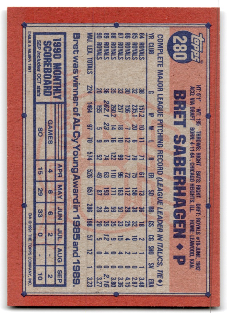 | 1991 Topps Baseball Card 280 Bret Saberhagen |