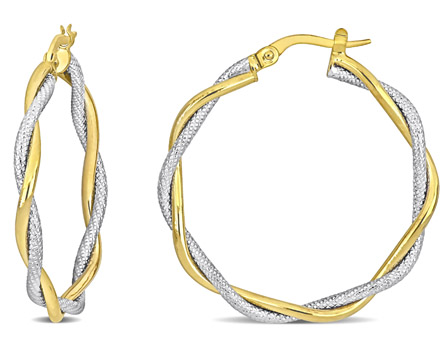 Look elegant and stylish in these glittering Twisted Hoop Earrings. Mounted in radiant two-tone white and yellow gold and feature twisted hoops. Polished to a brilliant shine, these hoop earrings are secured with a clip-in closures. Pair these alluring earrings with any ensemble and look stunning. These entangled hoop earrings are suitable for your business or casual look.