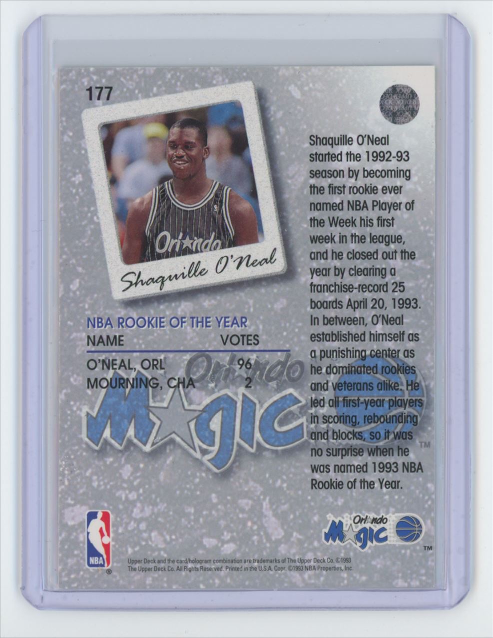 | Description: | Shaquille O'Neal | | Category: | Basketball | | Year: | 1993 | | Product: | Upper Deck | | Team: | Orlando Magic | | Card Number: | 177 | | Memorabilia: | Basketball Card | | Dimensions: | 4" x 3" |