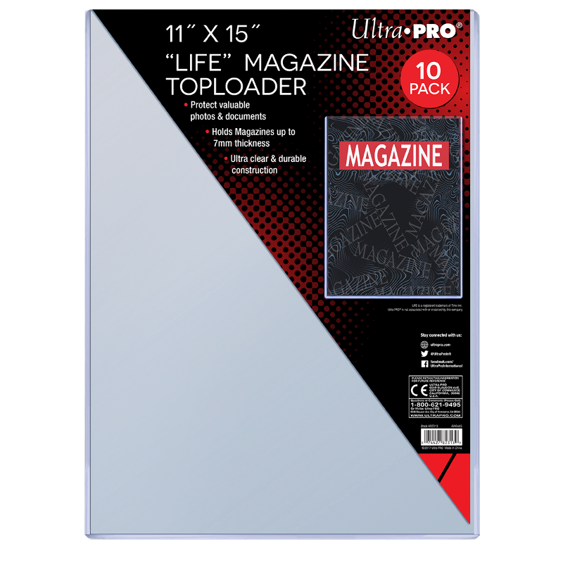 For collecting periodicals and magazines, use Ultra PRO's clear, 11" x 15" (279.4 mm x 381 mm) "Life Magazine" Toploaders. These Toploaders can hold contents up to 7mm in thickness and are ideal for keeping photos, magazines, and other collectibles protected and clean. Each pack comes with 10 Toploaders.
