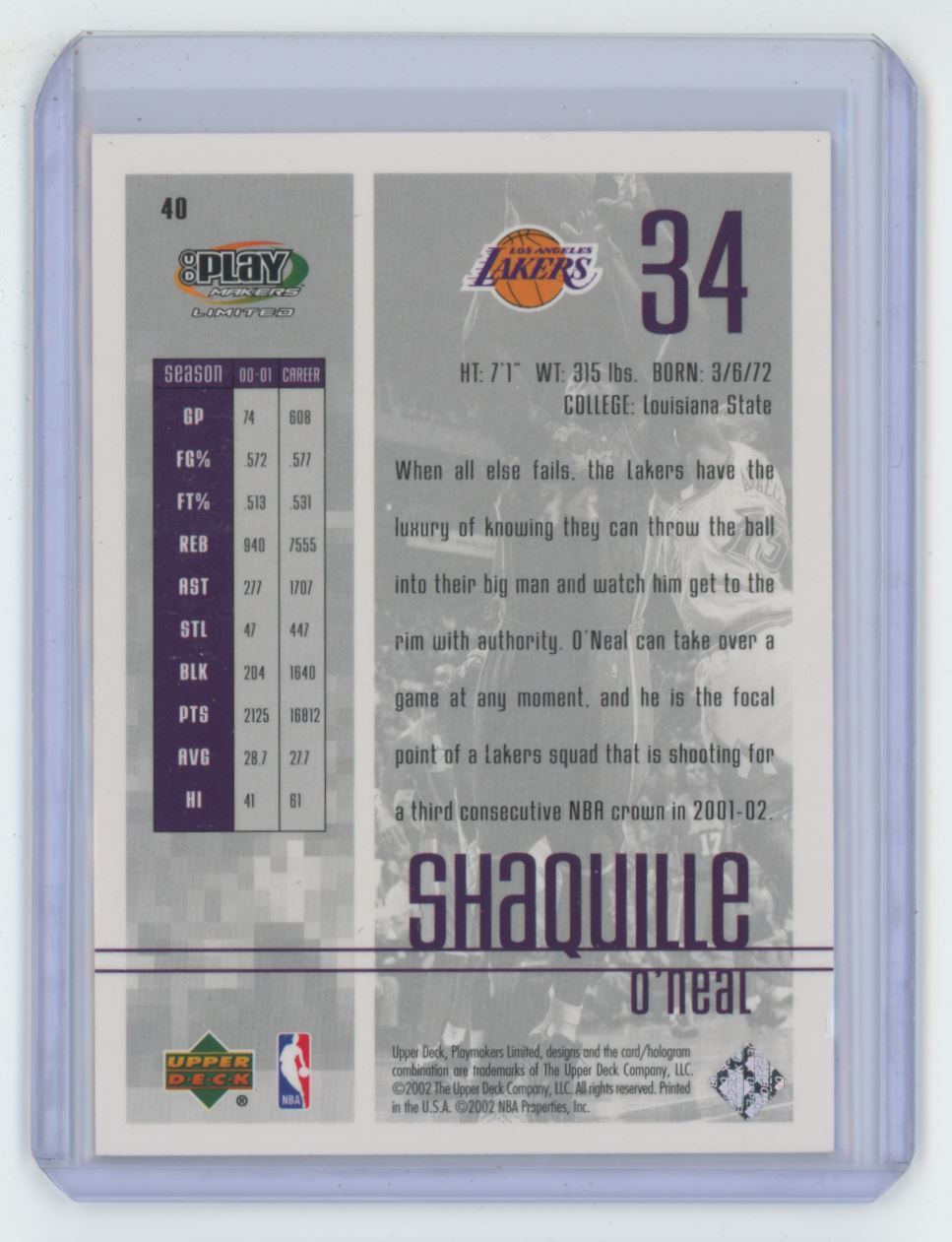 | Description: | Shaquille O'Neal | | Category: | Basketball | | Year: | 2002 | | Product: | Upper Deck | | Team: | Los Angeles Lakers | | Card Number: | 40 | | Memorabilia: | Basketball Card | | Dimensions: | 4" x 3" |