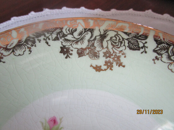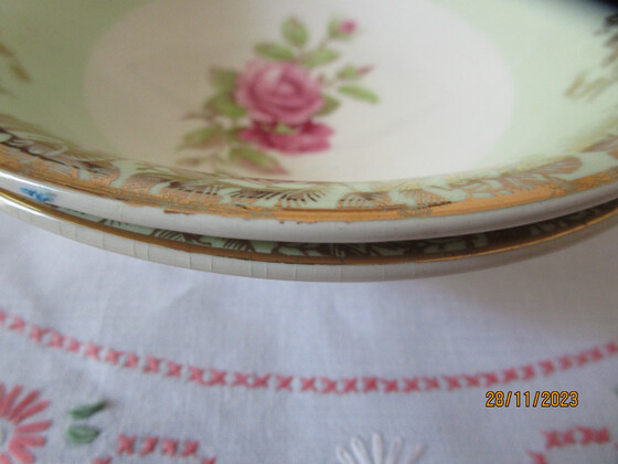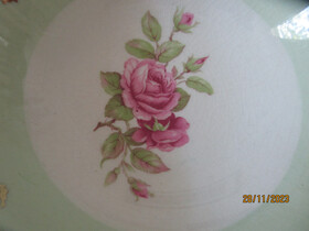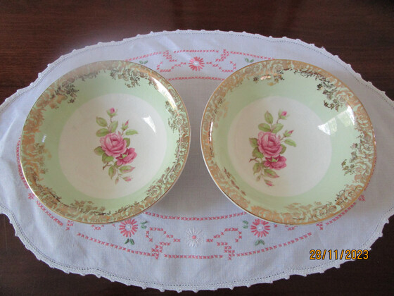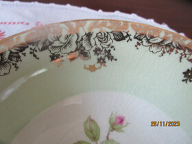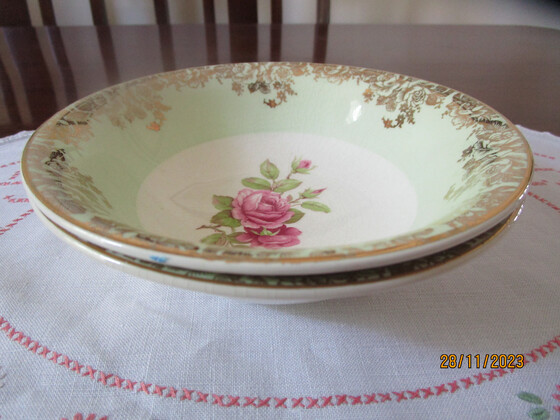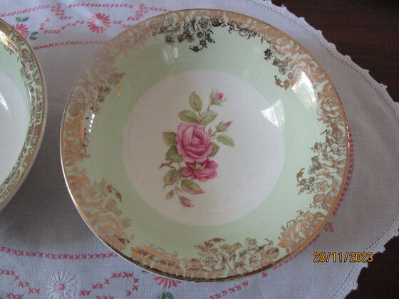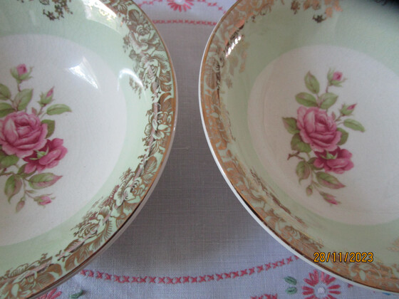 They are decorated with a classic Pink Roses design in the centre and a wide band of green around the sides with a gilt design over the green band and gilt trim on the rims.