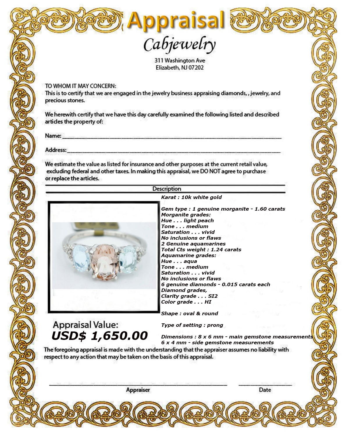 | 10K White Gold | New with tag | 1 genuine morganite - 1.60 carats Morganite grades: Hue . . . light pink-peach Tone . . . medium dark Saturation . . . vivid No inclusions or flaws 2 Genuine aquamarie-1.24 carats Aquamarine grades: Hue . . . aqua Tone . . . medium Saturation . . . vivid No inclusions or flaws 6 genuine diamonds-0.015 caras each Diamond grades Clarity grade.......SI2 Color grade.........HI |