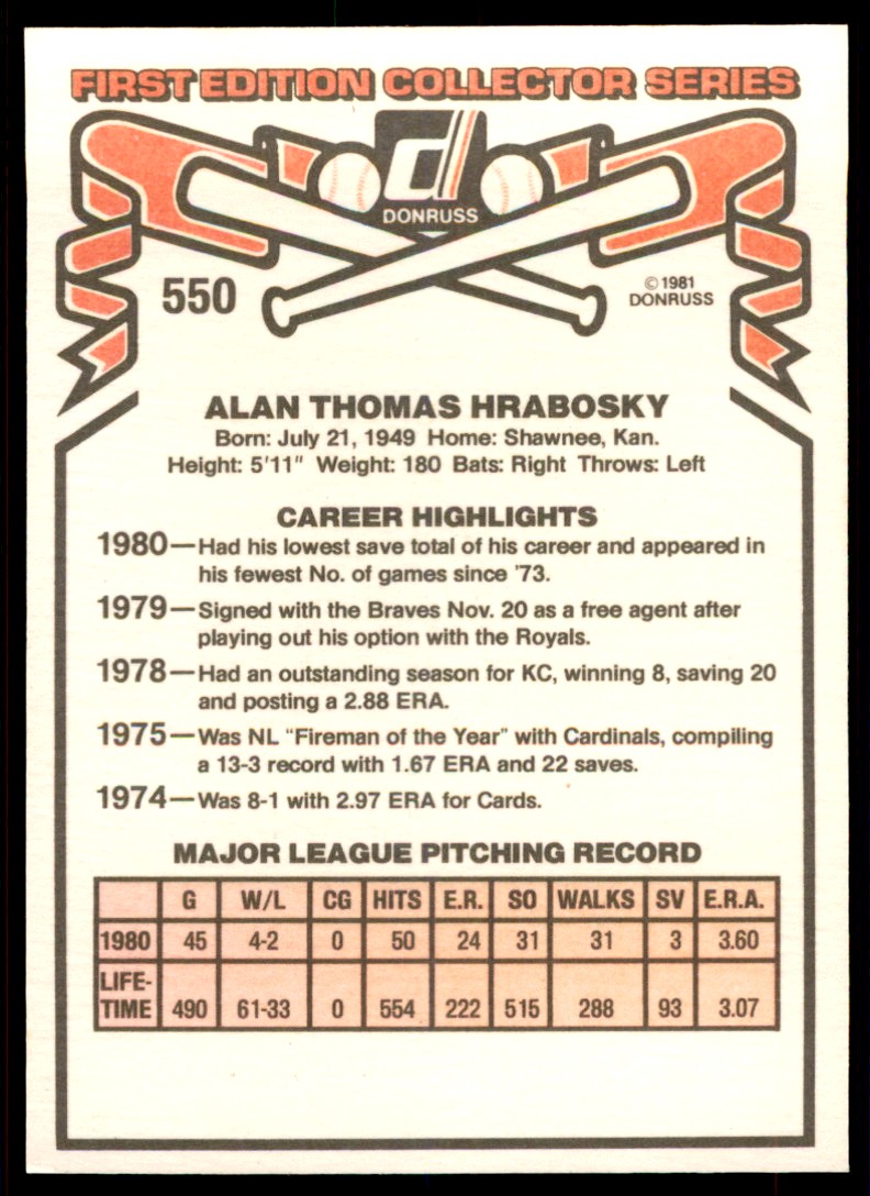 | 1981 Donruss Baseball Card Al Hrabosky Atlanta Braves #550 |