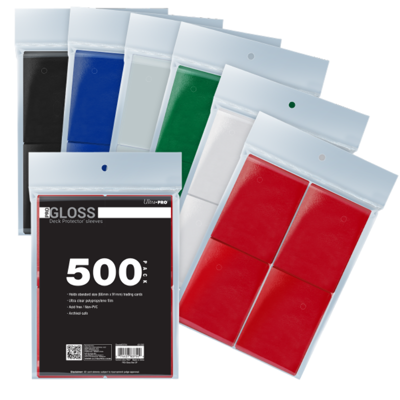 Made with acid-free, non-PVC polypropylene materials, our PRO-Gloss Deck Protector® sleeves will keep your cards safe from scratches and wear. The high-clarity gloss finish will display every beautiful detail of your cards, while the textured matte back keeps cards from sticking together and provides a smooth shuffle. Each pack includes standard size sleeves, which fit both Pokémon and Magic: The Gathering trading cards. You’ll know it’s Ultra PRO quality when you see the heat transferred holographic stamp. Available in 6 colors: Black, Blue, Clear, Green, Red, and White.