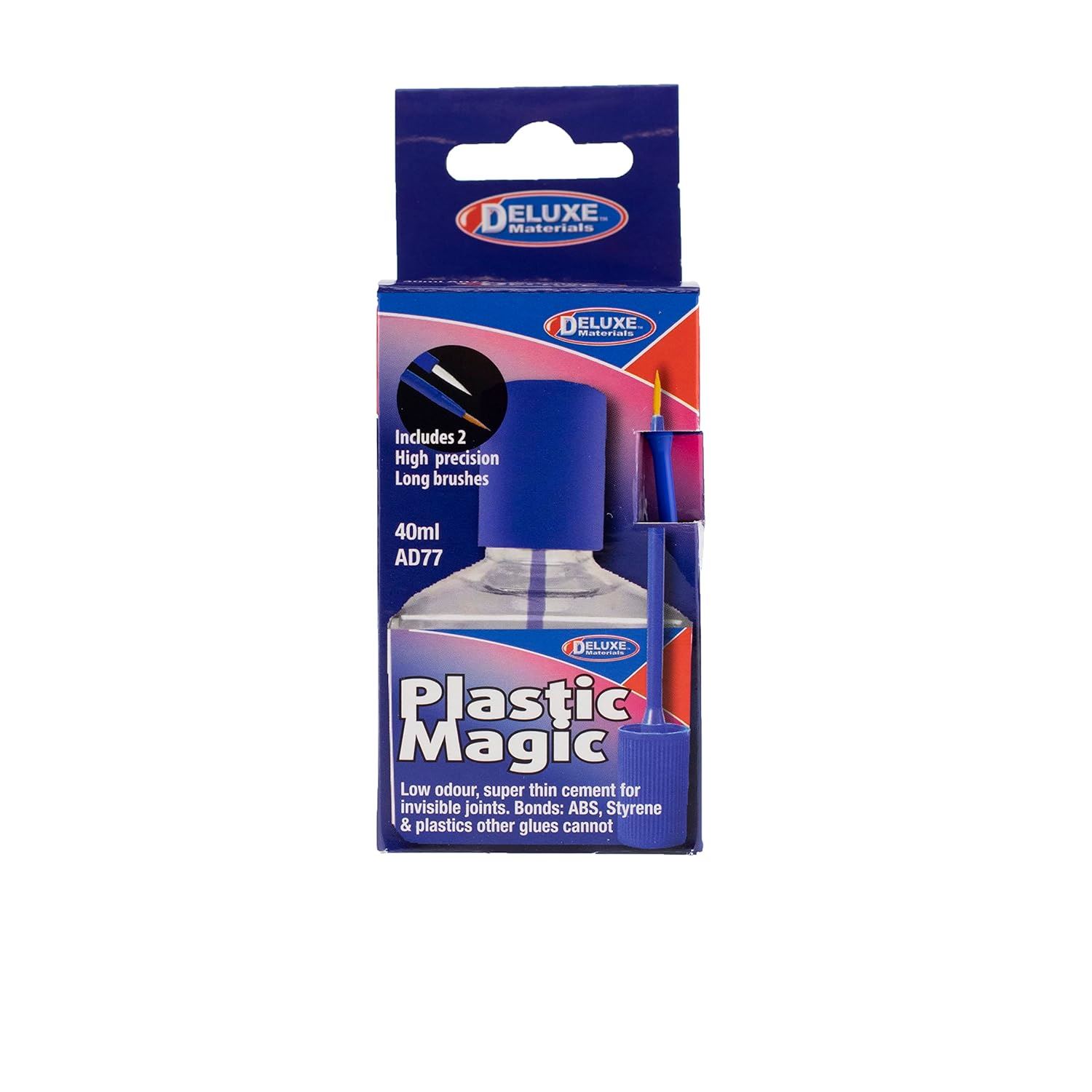 New Formula Plastic Magic (50ml) Now includes 2 High Precision Long Brushes. Plastic cement, invisible joints. For assembly of all types of plastic models. Bonds: styrene, polyester, arcrylic, pvc, butyrate, polycarbonate, ABS and plastic card. Manufactured by Deluxe Materials