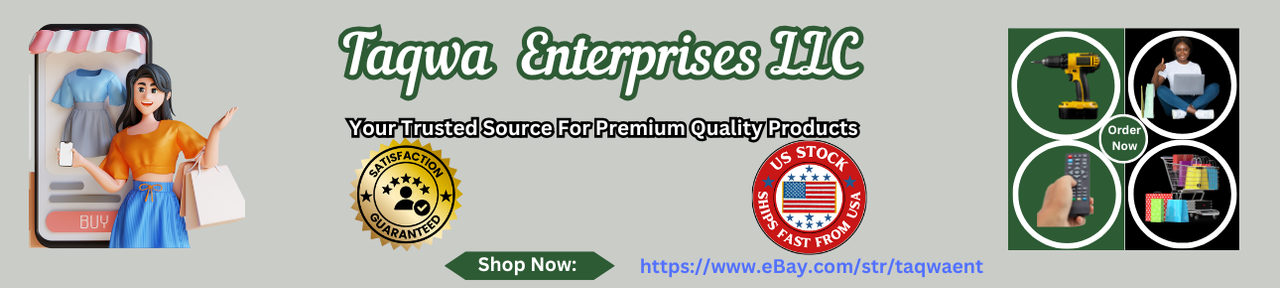 Taqwa Enterprise LLC, your trusted source for premium quality products, we pride ourselves on being a premier retailer of high-quality consumer goods. Our diverse range includes top-of-the-line electronics, stylish phone accessories, innovative home appliances, and premium health & beauty products. We are dedicated to offering exceptional customer service, competitive pricing, and a seamless shopping experience. Our committed team ensures every customer finds exactly what they need, enhancing their lifestyle with our quality products. Founded with a vision of excellence, Taqwa Enterprise LLC continually strives to exceed customer expectations. Even though we do not have any physical location, our user-friendly online platform allows for effortless shopping from home, 24 hours a day & 7 days a week. Trust Taqwa Enterprise LLC for all your retail needs, where quality and customer satisfaction are our top priorities.