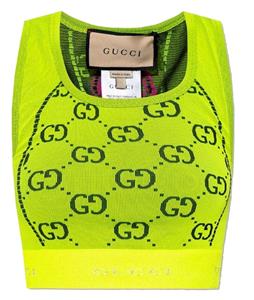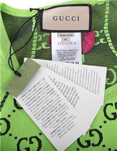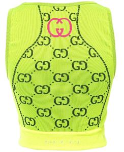 NEW WITH TAG GUCCI LOVE PARADE NEON GG EMBOSSED STRETCHY SPORTS LOGO CROP TOP. MADE IN ITALY. 100% AUTHENTICITY GUARANTEED. LUXURIOUS QUALITY TOP MADE OF SOFT STRETCHABLE FABRIC IN NEON LIME YELLOW COLOR WITH BLACK GG PRINT. PINK GUCCI INTERLOCKING EMBROIDERY ON THE BACK. 95% POLYAMIDE, 5% ELASTANE. SIZE MEDIUM.LENGTH ABOUT 16".