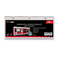 Ultra PRO's ONE-TOUCH® Double Booklet Card Holders for 185mm double booklet cards are premium trading card storage cases Designed as the final destination for your booklet cards, our two-piece ONE-TOUCH® holders are uniquely designed with a slide-in hinge and triple-tight magnetic closure. The holder provides UV-resistant, no-PVC, and acid-free protection to ensure your valuable hit retains its condition while under the display. Our ONE-TOUCH® booklet holder comes with a minimalist two-piece display stand with an adjustable viewing angle. This model can hold horizontal double booklet cards that open up to 185 millimeters in length.