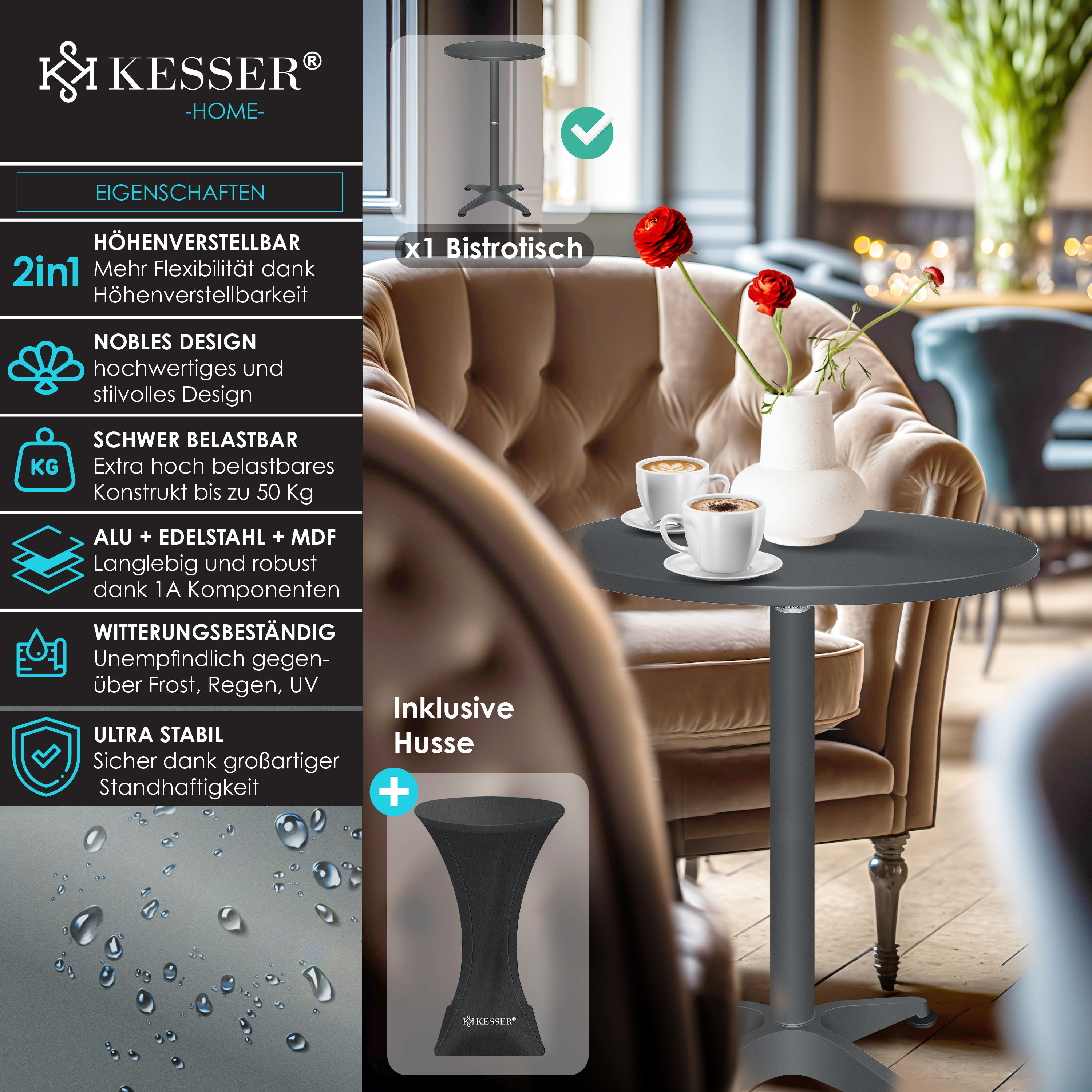 Entdecken Sie die grenzenlosen Einsatzmöglichkeiten dieses praktischen und stilvollen Tisches. Egal ob drinnen oder draußen, für private Feiern oder geschäftliche Veranstaltungen - mit unserem KESSER 2in1 Stehtisch / Bistrotisch sind Sie bestens ausgestattet und setzen ein klares Statement für Stil und Funktionalität.