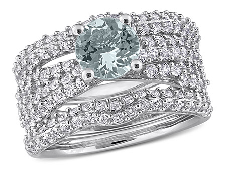 Introducing the stunning Women's 3 3/4 CT TGW Aquamarine and Created White Sapphire Bridal Set Ring in Silver. This exquisite bridal set features a mesmerizing engagement ring and two matching wedding bands, creating a coordinated and elegant look.The engagement ring showcases a captivating aquamarine center stone with a total gem weight of 3 3/4 carats, radiating a serene and icy blue hue. The surrounding created white sapphire gemstones add a touch of brilliance and sparkle, enhancing the overall beauty of the ring.Crafted in silver, this bridal set offers a timeless and classic appeal. The engagement ring and matching wedding bands stack together seamlessly, symbolizing the unity and commitment of your love.