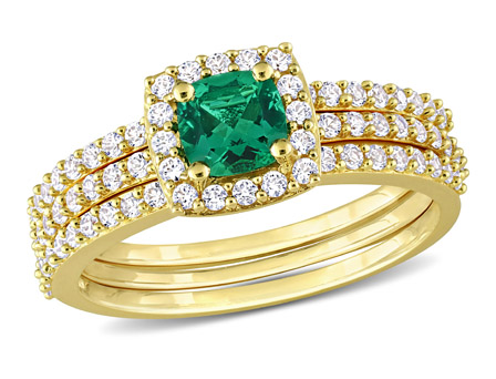Introducing the exquisite Women's 1 1/2 CT TGW Created Emerald and Created White Sapphire Bridal Set Ring in Yellow Silver. This stunning bridal set features a captivating engagement ring and two matching wedding bands, creating a coordinated and glamorous look.The engagement ring showcases a mesmerizing created emerald center stone with a total gem weight of 1 1/2 carats, radiating a vibrant and lush green hue. The surrounding created white sapphire gemstones add a touch of brilliance and sparkle, enhancing the overall beauty of the ring.Crafted in yellow silver, this bridal set offers a luxurious and timeless appeal. The halo design around the center stone and the matching wedding bands create a seamless and elegant look, symbolizing the eternal bond of your love.