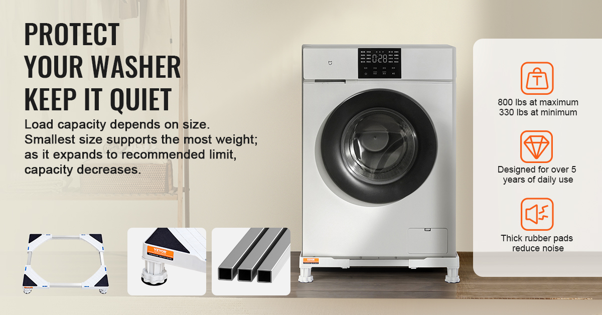 The extendable washing machine pedestal, featuring reinforced stainless steel pipes, supports a minimum load of 800 pounds (362.9kg) at its smallest size and a maximum load of 330 pounds (149.7kg). Ideal for elevating various household appliances.