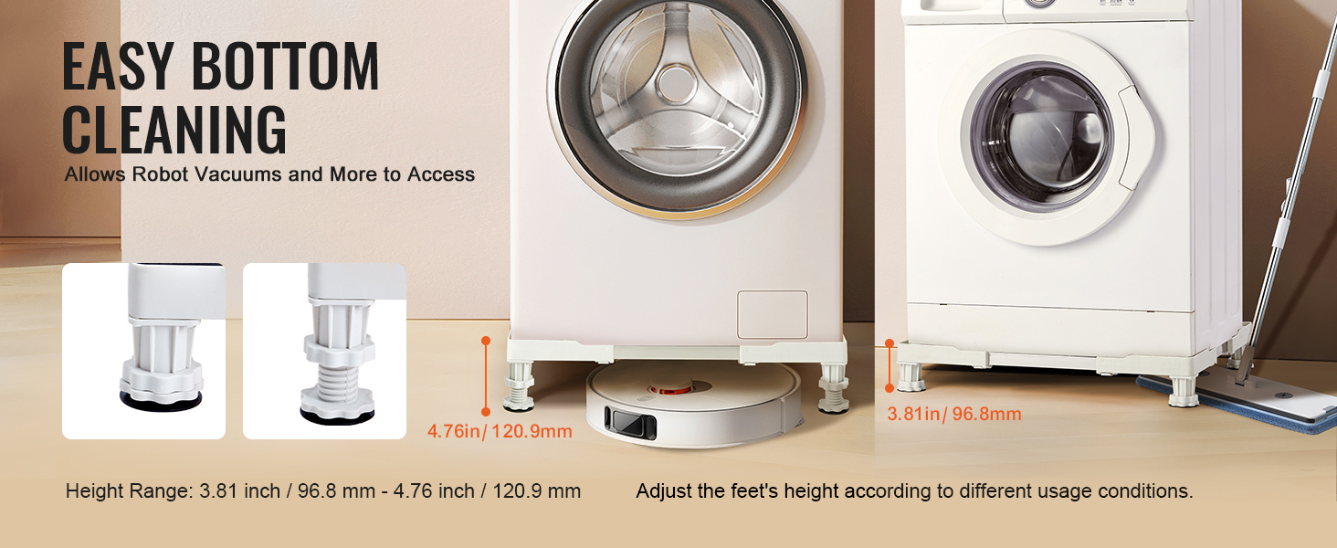 Adjustable Height Legs: Equipped with raised support legs, the height can be adjusted within the range of 3.81 inches (96.8mm) to 4.76 inches (120.9mm), allowing for convenient height adjustments to facilitate cleaning in different environments.