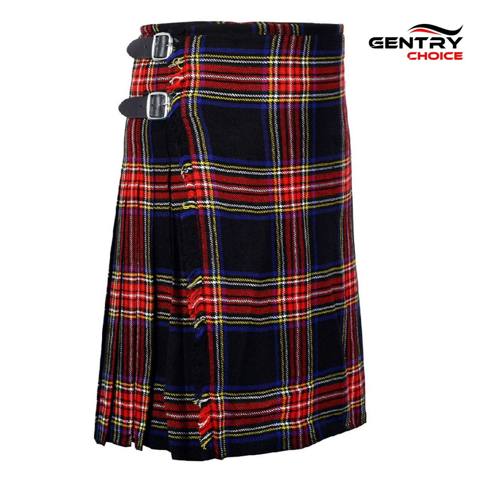 Embrace Scottish tradition with the Black Stewart Tartan Kilt 8 Yards, made with a premium 80% Acrylic and 20% Wool blend, this Scottish Kilt beautifully mirrors the drape and weight of authentic wool without the itchiness. Whether you are attending a formal event, Scottish wedding, Highland games, or simply want to showcase your cultural pride, this Highlander dress kilt is a versatile outfit. Designed in a classic 8-yard length, the Scottish Utility Kilt displays deep 3.5" pleats and a standard 24" drop. The Black Stewart plaid skirt pattern with its bold black hues and intricate detailing honors Scottish heritage. The wedding dress kilt features 3 genuine leather straps and rust-resistant buckles, allowing for seamless size adjustments up to two inches up or down, the 12 oz fabric weight. Perfect for formal events or worn casually with a shirt, this Highland Games Kilt is a must-have for men who appreciate tradition.