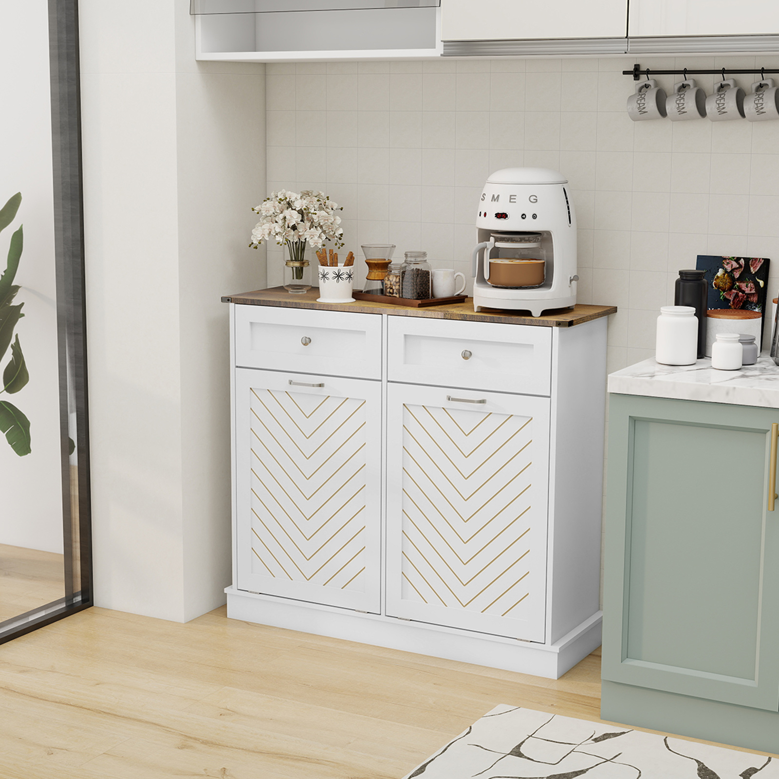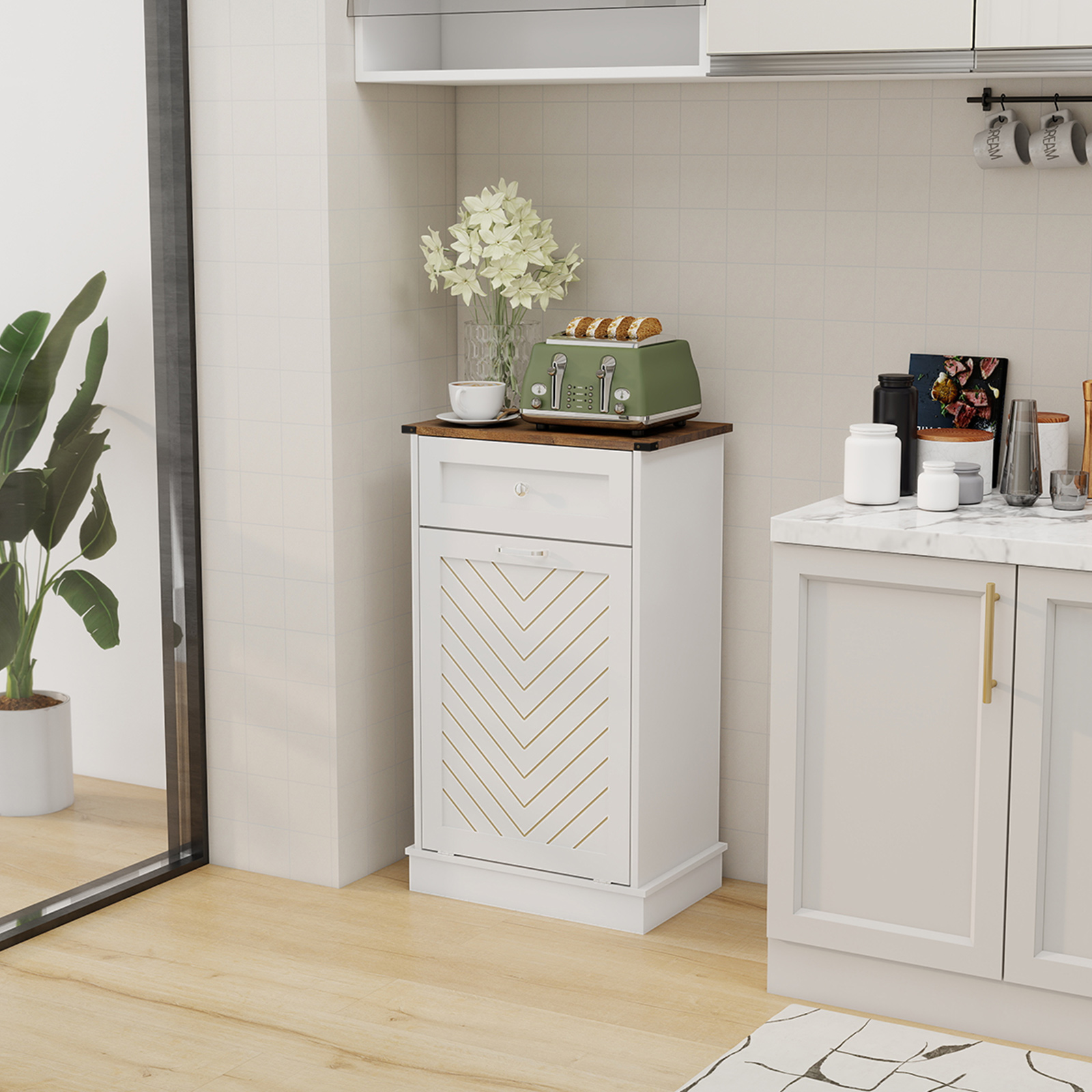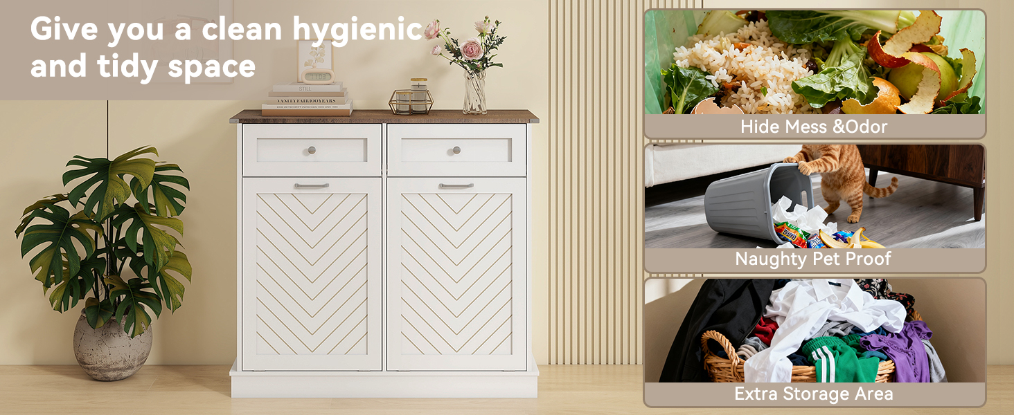 【Multifunctional Storage Cabinet】-- This tilt out trash cabinet not only can be used as a kitchen cabinet to hide smelly trash, but also can be used in your bathroom, laundry, corridor ,living room, and any other corner to hold towels, clothes, toys, and other items. Equipped with 2 pull-out drawers, you can store kitchen supplies, pet food,etc. A perfect cabinet to save space for your house!