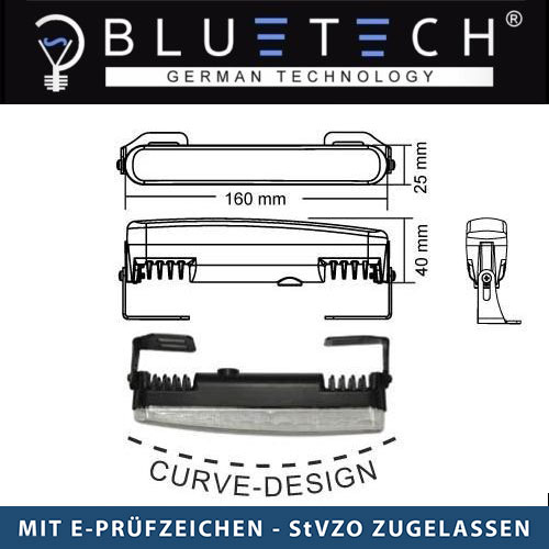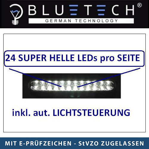 Mit 24 super hellen, langhaltigen(ca 70.000 Betriebsstunden) SUPER FLUX LEDs pro Leuchte. Das flache, aerodynamische geschwungene Form entsprechend der PKW Rundungen ermöglicht die Montage an schmalen Stellen im Frontbereich. Dank integrierten Steuermoduls, sehr einfache Montage. Wetter-und wasserspritzfest.