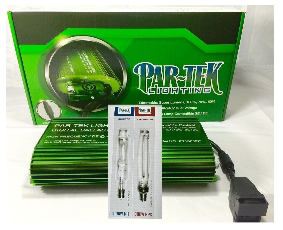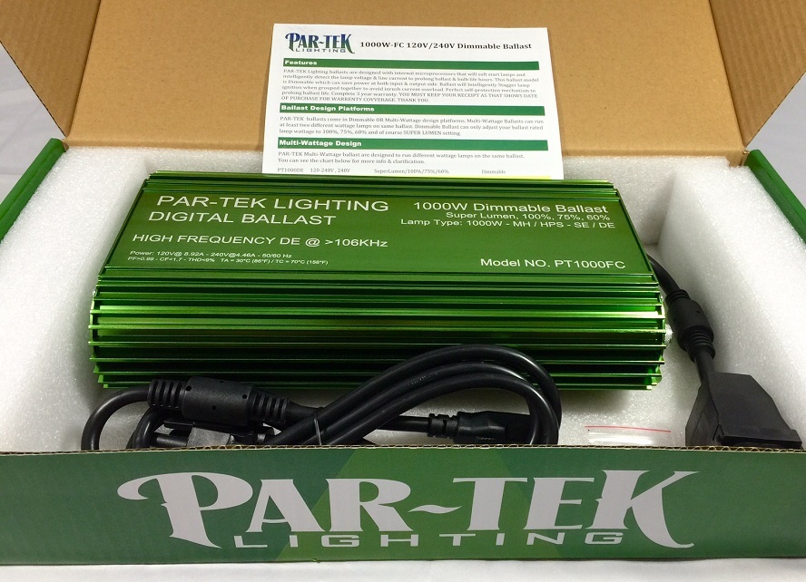 PAR-TEK LIGHTING 1000W Digital Ballast operates on either 120v or 240v power supply. The PT1000FC Ballast is on the Dimmable Design Platform which operates a 1000W Lamp with the capabilities to DIM the lamp when less light is needed. PT1000FC can fire both High Pressure Sodium & Metal Halide Bulbs. This ballast can also fire Double Ended DE lamps in both MH & HPS as well, Ballast operates at High Frequency of 106KHz. Don't for get SUPER LUMENS which will give 10% more light at the flick of a switch. Optional settings are Super Lumens, 100%, 75%, & 60%.