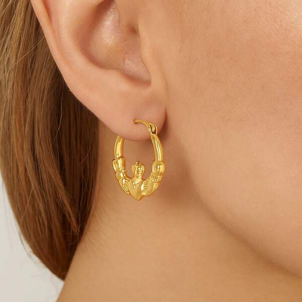 10k yellow gold, these oval earrings featured a Claddagh motif and secured with a snap post backing.