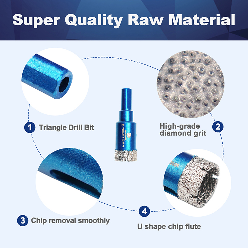 2.Dia 6-10mm: internal wax cooling, dry drilling without water; When drilling, the wax will melt to lubricate and cool the drilling surface;